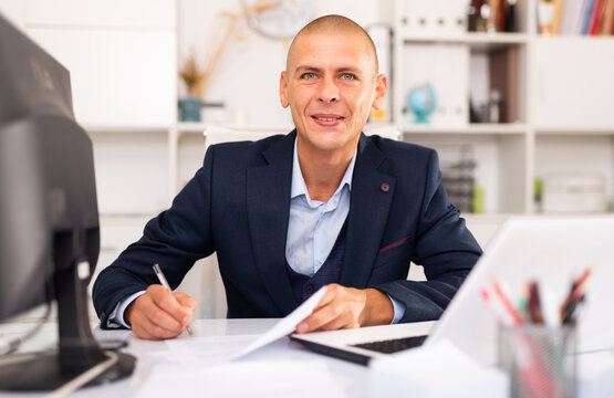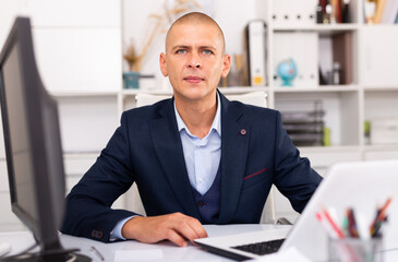 Focused adult successful man working with computer in modern office