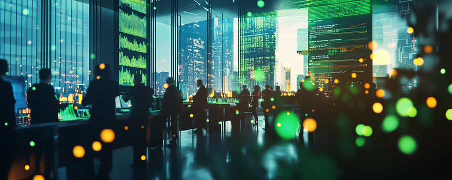 A bustling trading floor with professionals engaged in stock market activities, surrounded by screens displaying financial data and trends.