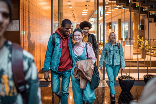 A close-up photograph of students exiting a university, with a backdrop of the campus and bustling student activity