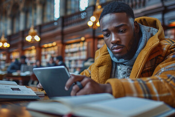 Focused Student Studying with Books and Tablet Outdoors. A diligent student is deeply focused on studying with textbooks and a tablet at an outdoor setting, illuminated by natural sunlight.