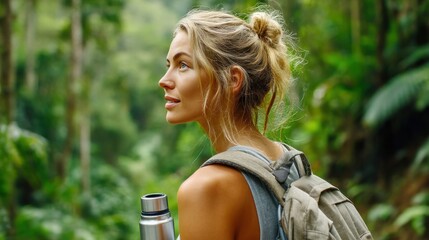 Blond woman hiking in a lush green forest with a backpack and hydration bottle.