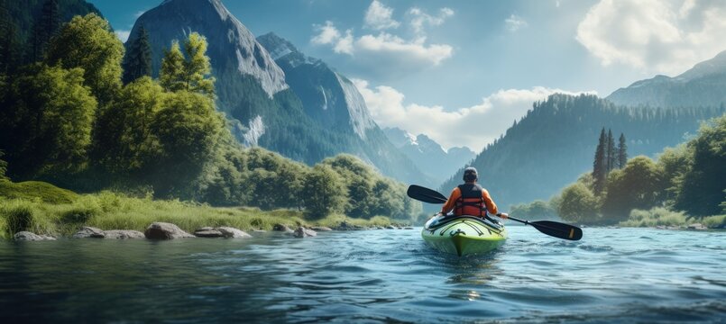 kayaking kayaker on a rapid in forest background with mountain scenery