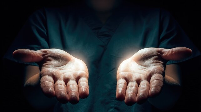 Hands open as if presenting light in a dark background during a medical or healing activity