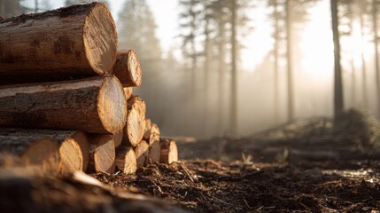 Logging activity in a forest wood stacks nature photography early morning tranquil atmosphere
