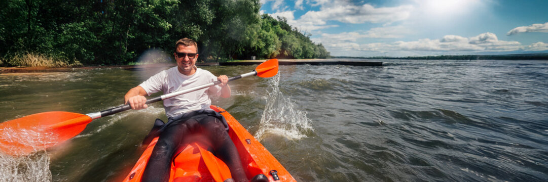 Two smiling friends kayaking on a lake together during summer break. Smiling and happy playful women bonding outside in nature with water activity. Having fun on a kayak during weekend recreation