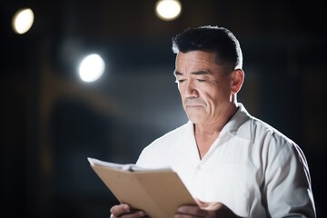 stage actor rehearsing on an empty theater stage, dramatic spotlights shining down, with scripts and props scattered across the set
