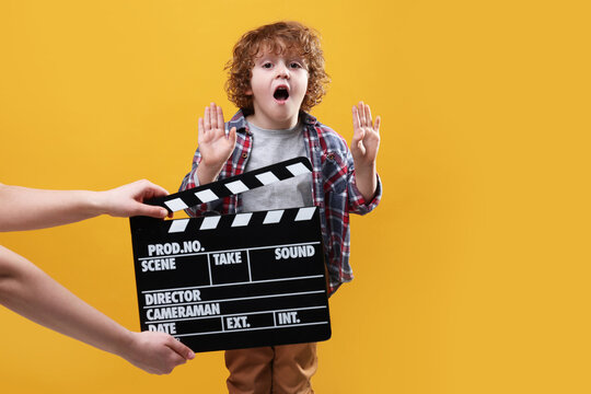 Emotional cute boy performing while second assistant camera holding clapperboard on orange background. Little actor