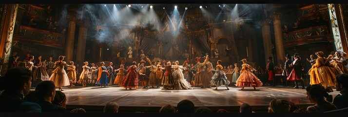 Actors in beautiful costumes perform energetically on stage while an enthusiastic audience watches intently from below. Generative AI