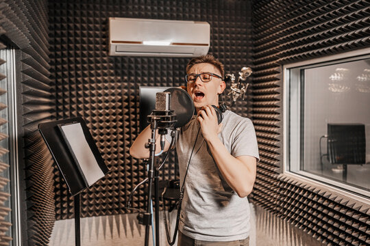 The vocalist sings in the studio in a microphone. Man in headphones writes a podcast, an audiobook. Artist, recording an album, working with the label. Announcer records a speech at a radio station