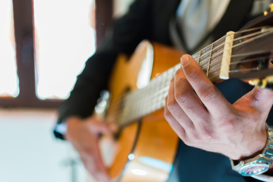 Foto de hombre sentado inclinado sostiene guitarra acústica instrumental tocando canción