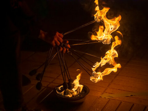 Manos encendiendo con llamas, antorchas de malabares, para actuar en una fiesta, Barcelona 2022