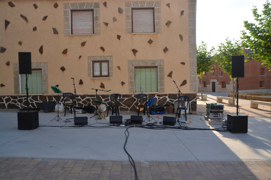 Escenario vacío con las luces encendidas. Espacio listo para un espectaculo.