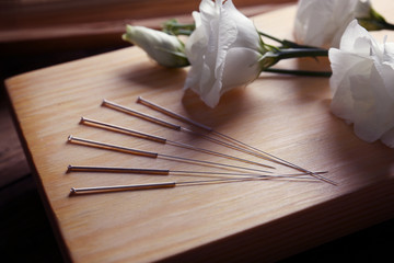 Acupuncture needles with flowers on wooden board