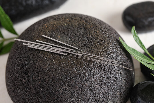 The doctor sticks needles into the girl's body on the acupuncture - close up