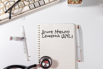 Note Reading “Acute Myeloid Leukemia (AML)” on Doctor’s Desk – Rapid Blood Cancer Alert with Medical Tools