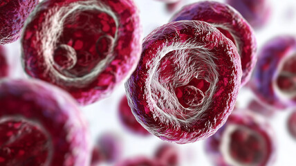 a vibrant microscopic view of malignant hematologic cells, their structure distorted and disorganized, while GFH009, represented by a glowing pathway