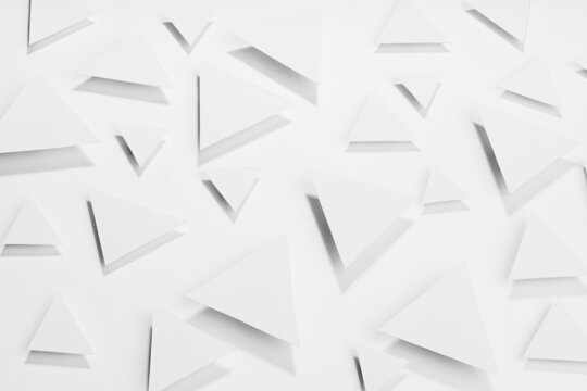 White simple geometric background with flying triangles in hard light with soft grey  sharp shadows as calm pattern, top view. Futuristic minimal backdrop for advertising, design of poster, flyer.