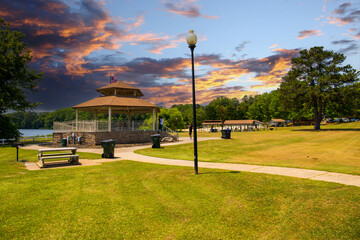 a brown pergola in the park surrounded by lush green trees, grass and plants with a blue lake and a smooth winding footpath with powerful clouds at sunset at Cauble Park in Acworth Georgia USA