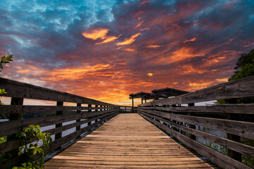 Wooden bridge on the lake at sunset