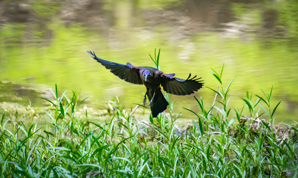 Boat-tailed Grackle flying from long grass at Lake Acworth in Georgia.