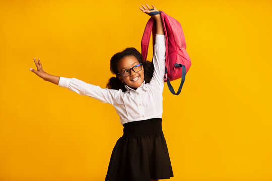 Carefree African American Schoolgirl With Backpack Posing, Studio Shot