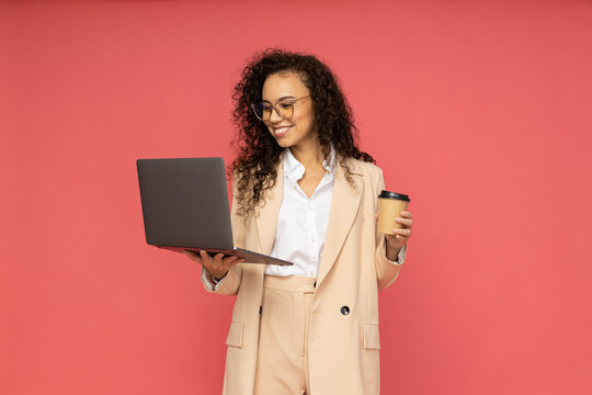 Young business woman on pink background, business and job