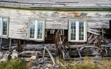 Decaying facade and windows of the historic Bering Hill Chapel on Adak Island
