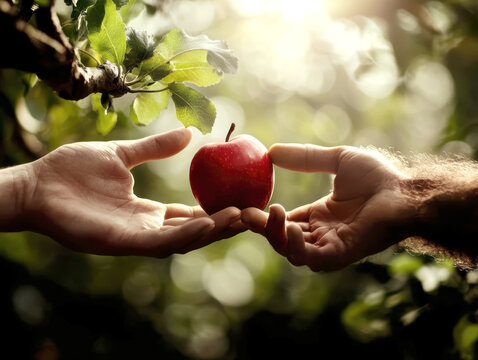 Symbolic temptation  hand with red apple, snake, eve   free will, good and evil, disobedience