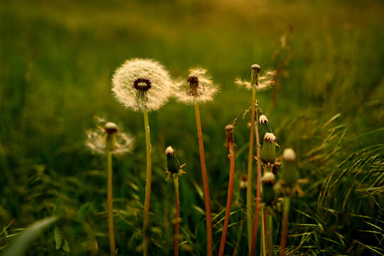 A dandelion bush in a meadow. Fluffy aduvanchichi lit by warm evening light. White adandelions on a summer meadow in the evening. Large photo