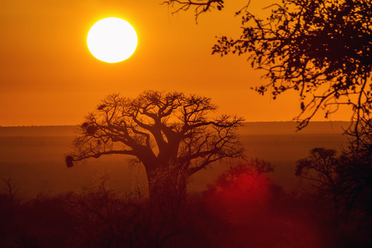 Baobab tree in sunrise landscape in Kruger National park, South Africa ; Specie Adansonia digitata family of Malvaceae