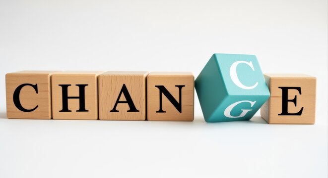 Change concept spelled out with wooden blocks, blue block flipping to spell 'Chance' isolated