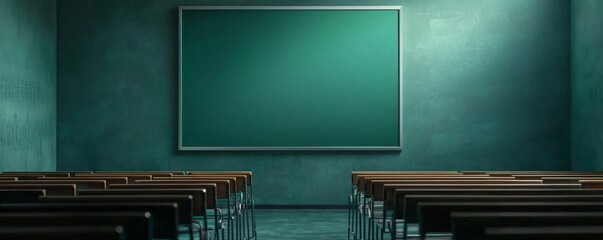 Digital transformation and adaption technology. Colorful neon light display in a classroom setting with wooden desks.