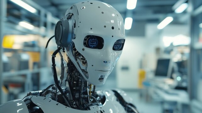An extreme close-up of the adaptive learning algorithms and educational content delivery of a humanoid tutor robot in an educational robotics center, Robotics style, photo of