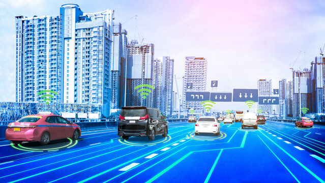 Autonomous car sensor system concept for safety of driverless mode car control . Future adaptive cruise control sensing nearby vehicle and pedestrian . Smart transportation technology .