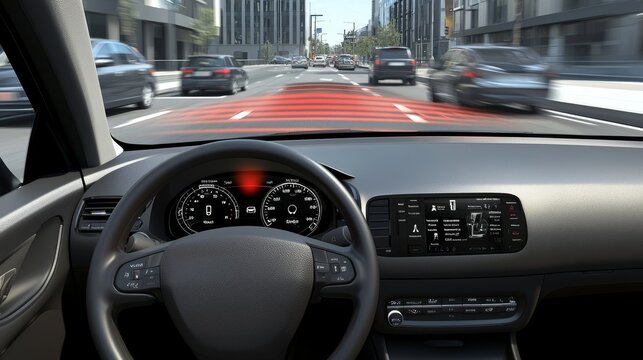 Interior of an autonomous car with adaptive cruise control, highlighting the dashboard display, speed control, and distance sensor feedback, while the car adjusts to changing traffic conditions.