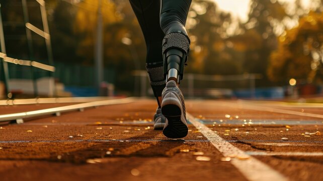 Athletic Prosthetic Runner on Track at Sunset. Generative ai