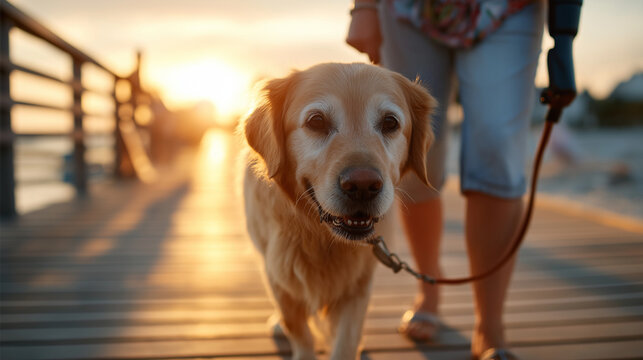 Boardwalk medium shot of a woman with a prosthetic arm walking her dog at sunset, leash wrapped comfortably, ocean breeze, warm glow, dog walking, accessibility, prosthetic arm, co