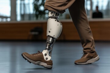 Man confidently walking on the street with a prosthetic leg during a sunny day in an urban environment