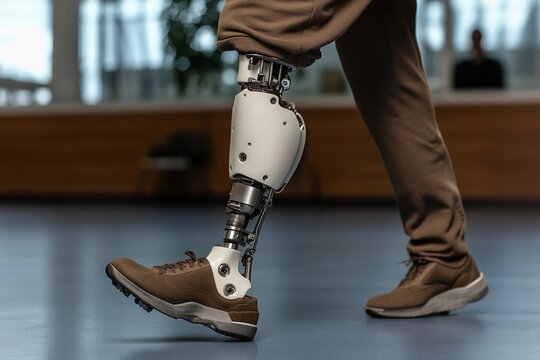 A disabled man with a prosthesis walks on the sidewalk. Elegantly dressed.Artificial robotic leg.