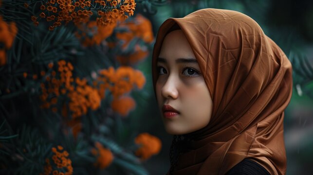 A depiction of an Oriental Indonesian female donning a chestnut headscarf and dark attire.