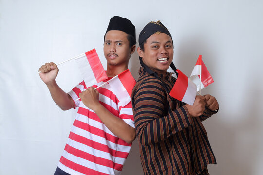 Portrait of two cheerful Asian man from Javanese and Madurese tribes celebrating independence day on 17 August while holding indonesian flag. Isolated image on white background