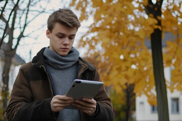 Ad Blocker on Tablet: Man in Urban Setting Prevents Advertisement on Screen