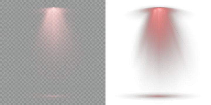 Reflections add depth to spotlight scenes on floor. Stage spotlights emit strong white directional light beams. Light Effects. Concert lighting set includes soft beams. Transparent background. Scene.