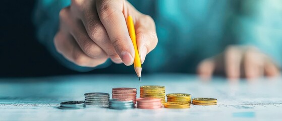 A hand adding coins with a pencil, symbolizing financial planning and savings.