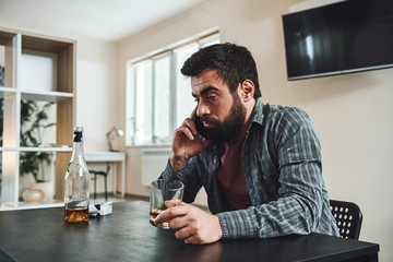 The only way to get over the pain is to face it, embrace it, hug it and learn the lessons embedded within it. Young man alcoholic, social problems concept, sitting, drinking whiskey