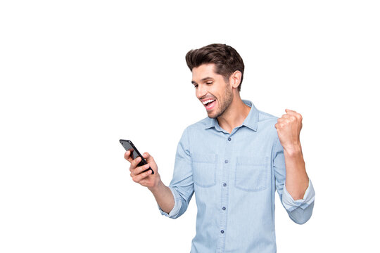 Waist up portrait of joyful freak getting kaif from drugs. His eyes are closed. Isolated on background