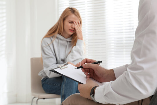 Psychotherapist working with drug addicted young woman indoors