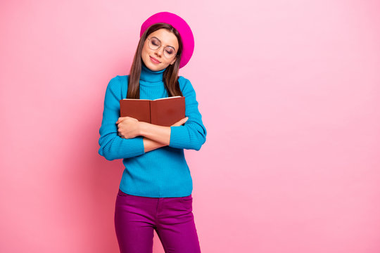 Portrait of lovely girlish girl addicted nerd geek hug her favorite book enjoy fall free time close eyes wear blue purple outfit isolated over pink pastel color background