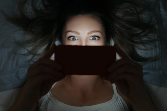 Young female addictively staring at her smartphone late at night in bed. Focused on eyes. Phone dependence concept. Horizontal shot.