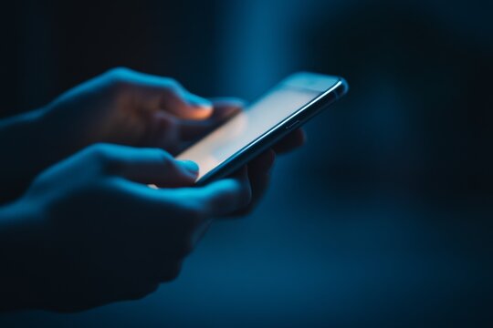 Point finger on screen phone closeup, person testing test message, touch blue screen on smartphone. Night Bokeh Light. Close-UP. Person using in hands mobile phone close up in the dark. Online wi-fi